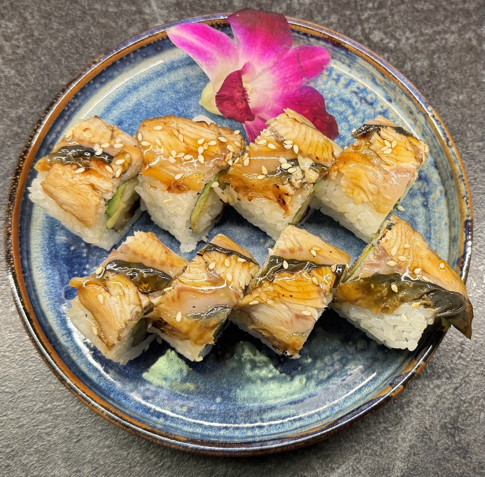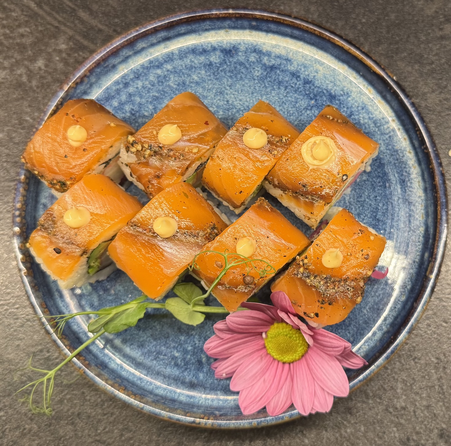 szparagi w tempurze, rzodkiew, ogórek, jalapeno, owinięte mango i karakuchi, tobico